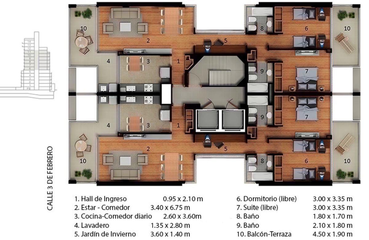 Ventilación cruzada y con amplios balcones-terrazas en los ambientes principales, lavadero independiente.